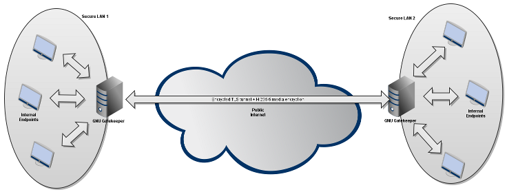 GnuGk can encrypt call signalling between those locations using TLS and encrypt the media (RTP) using H.235.6 (AES encryption).